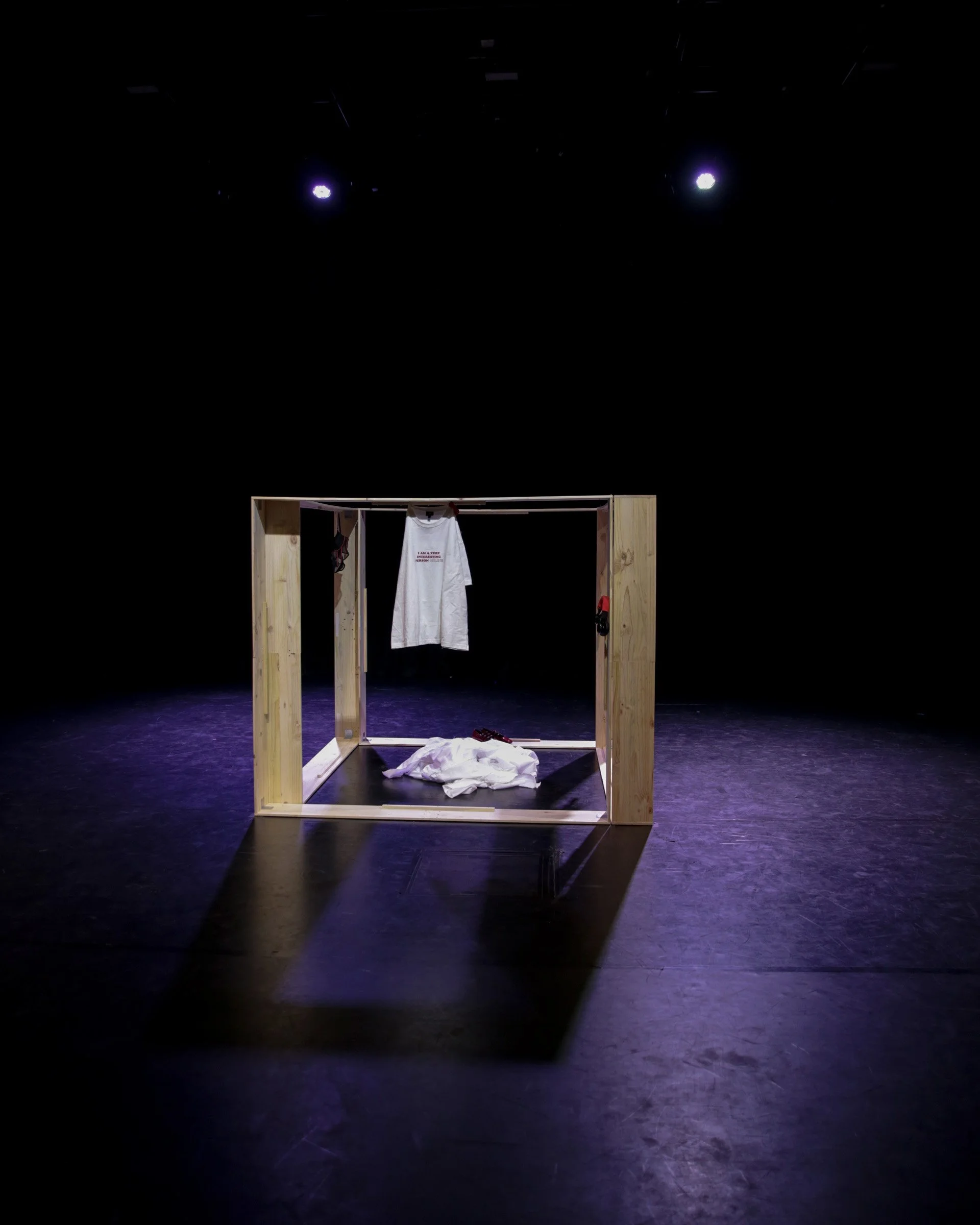 Angelehnt an die Kostüme der Performanden erstrahlt das Plakat in einem intensiven Rot und wird durchbrochen von einer schweren, abstrakten Masse, die einst aus einer metallischen Träne entstand.